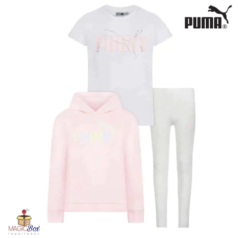 Esse lindo conjunto da PUMA inclui moletom rosa com capuz e bolsos laterais, camiseta manga curta e legging, todas as peças contém o logotipo da marca.